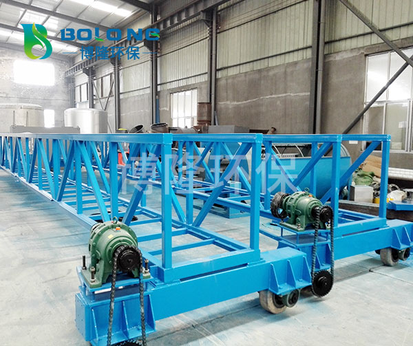 本設備由四點支撐行走大梁橫跨在平流式沉淀池上,雙邊驅動,池兩邊均鋪設鋼軌,從池的一端運行到池子的另一端,邊行走邊吸泥,撞到行程控制,折返行走,回程吸泥,完成一個工作周期。